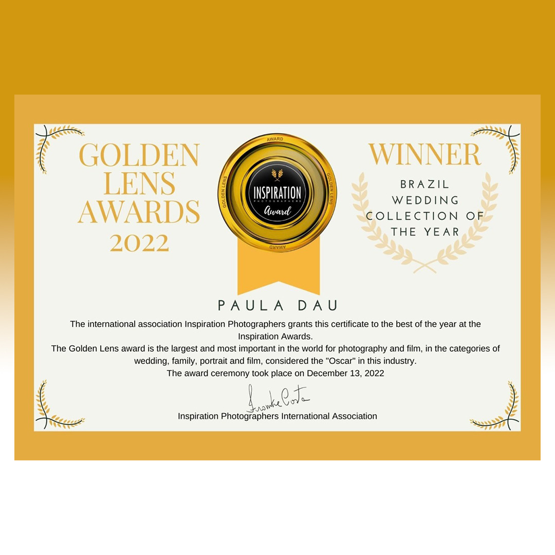 E diante desse olhar, dessa proposta envolta pelo amor, recebemos o Golden Lens de Melhor Álbum de Casamento do Ano de 2022. Para a nossa surpresa, eu, Paula Dau, sou a primeira mulher do Brasil a receber essa honraria tendo concorrido ao lado de grandes contadores de história de todo o país.